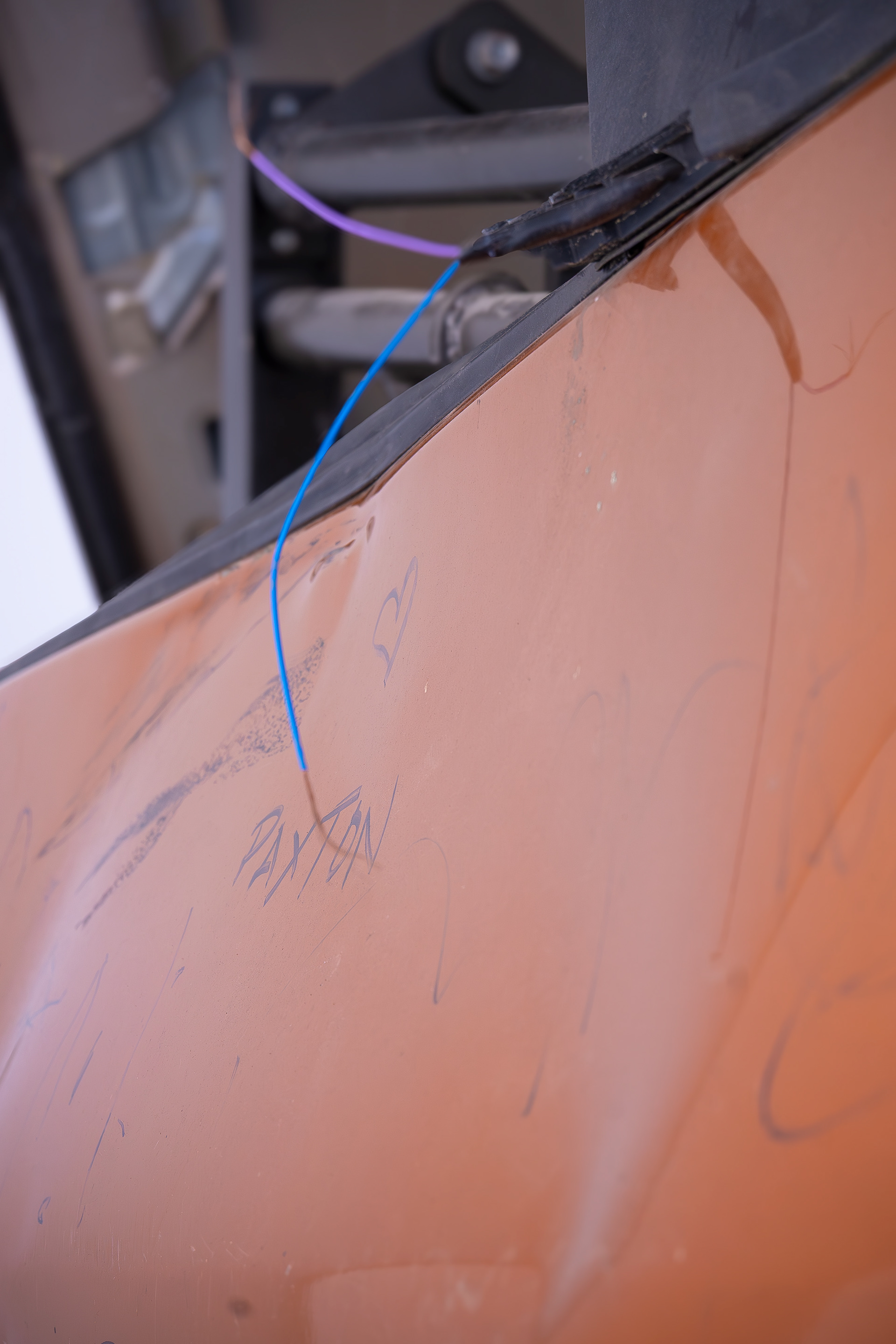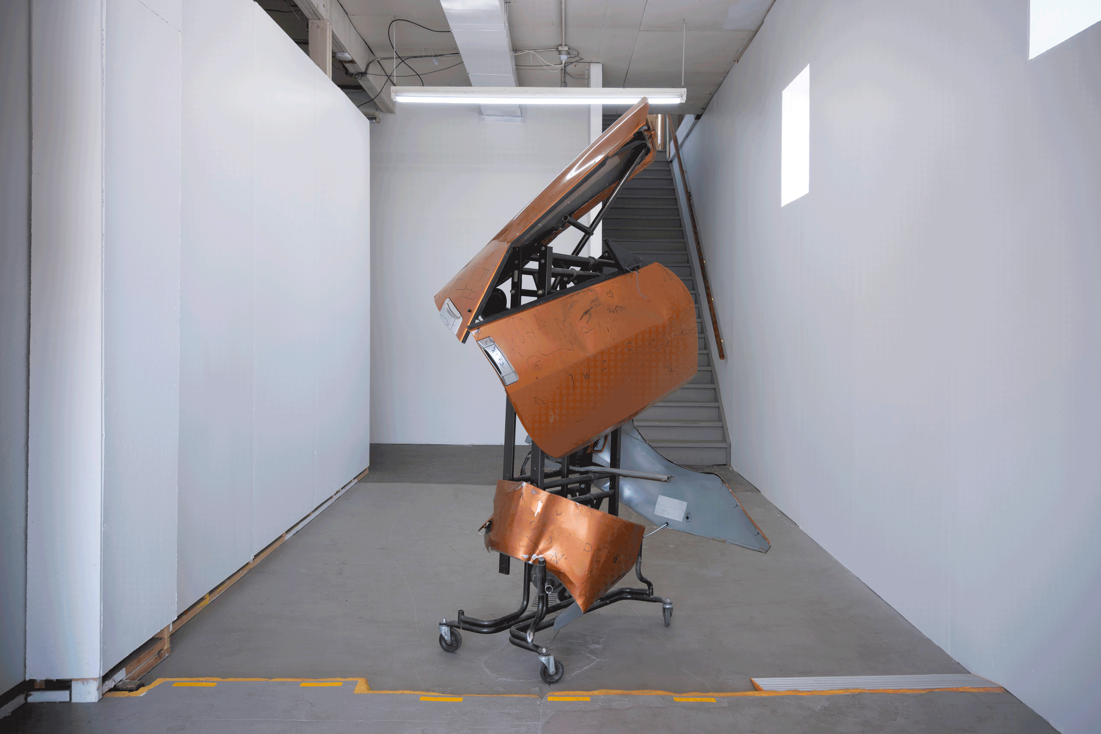 Found object assemblage created from salvaged car panels from a mid-2000s performance vehicle. In marker, children's handwriting covers the car paint of the doors and quarter panels. A father above the Ohio River Valley uses scrap vehicles in his yard to teach his two sons to read and write. This project tells the story of this hardworking family balancing the needs of their children and the demands of parenthood.