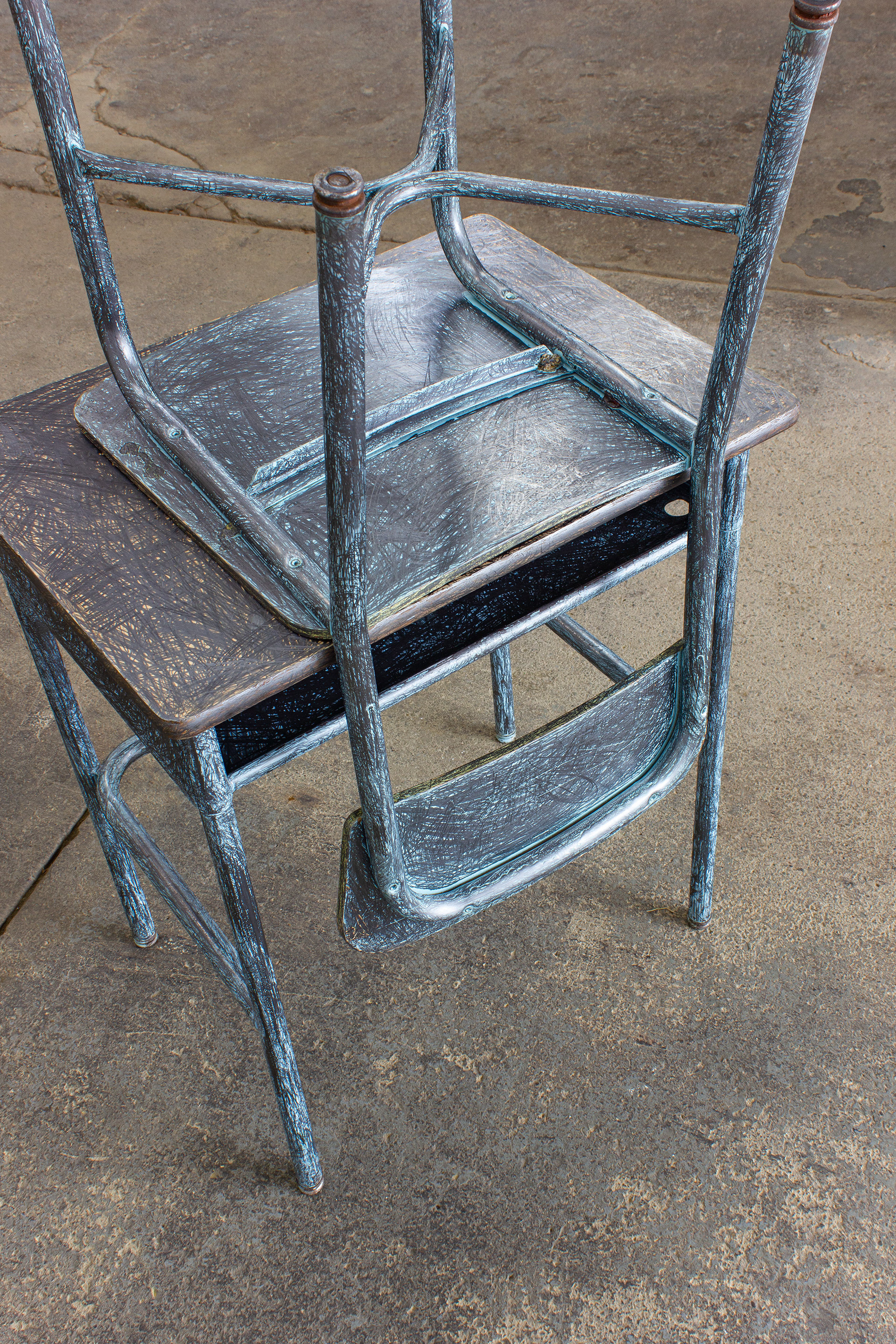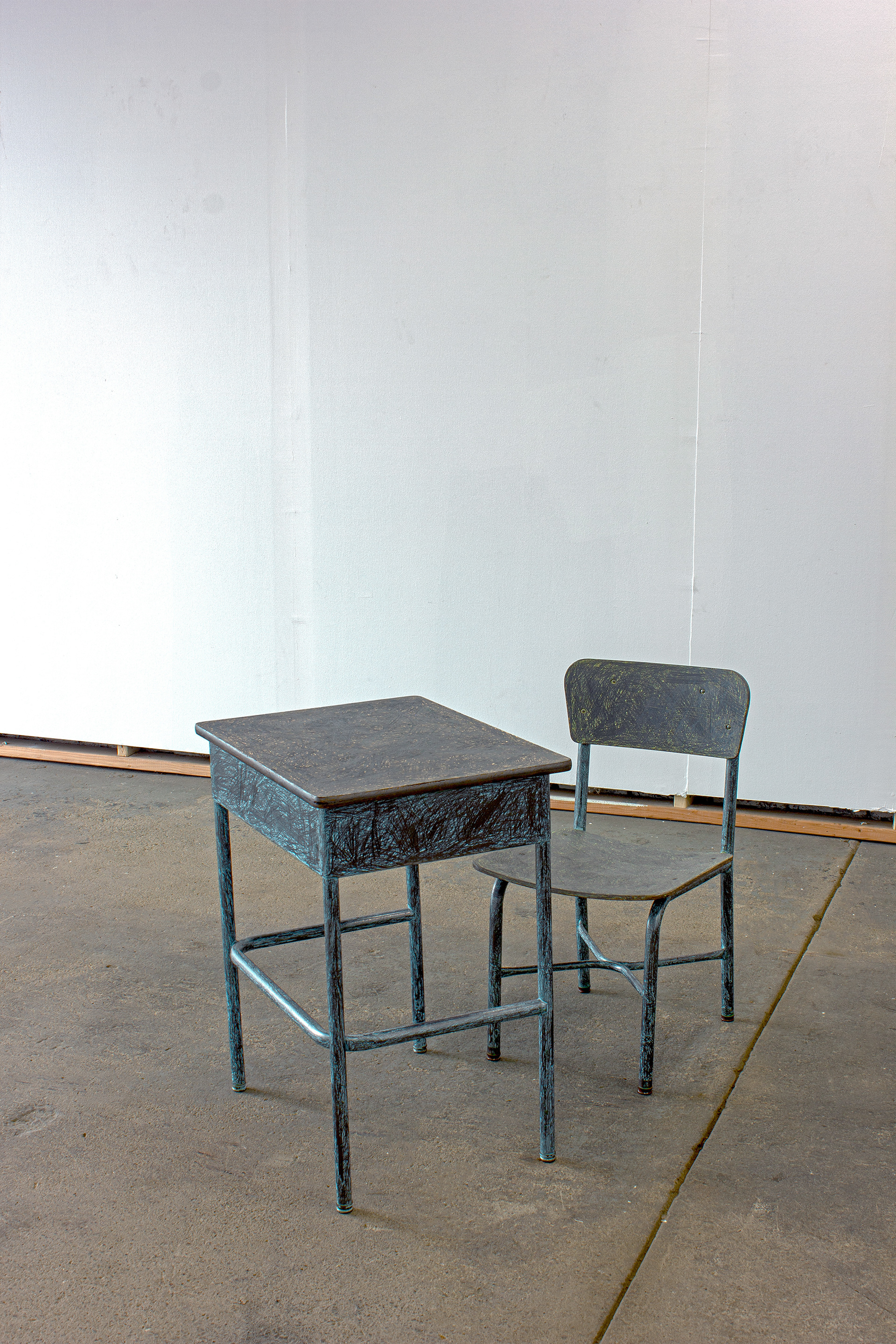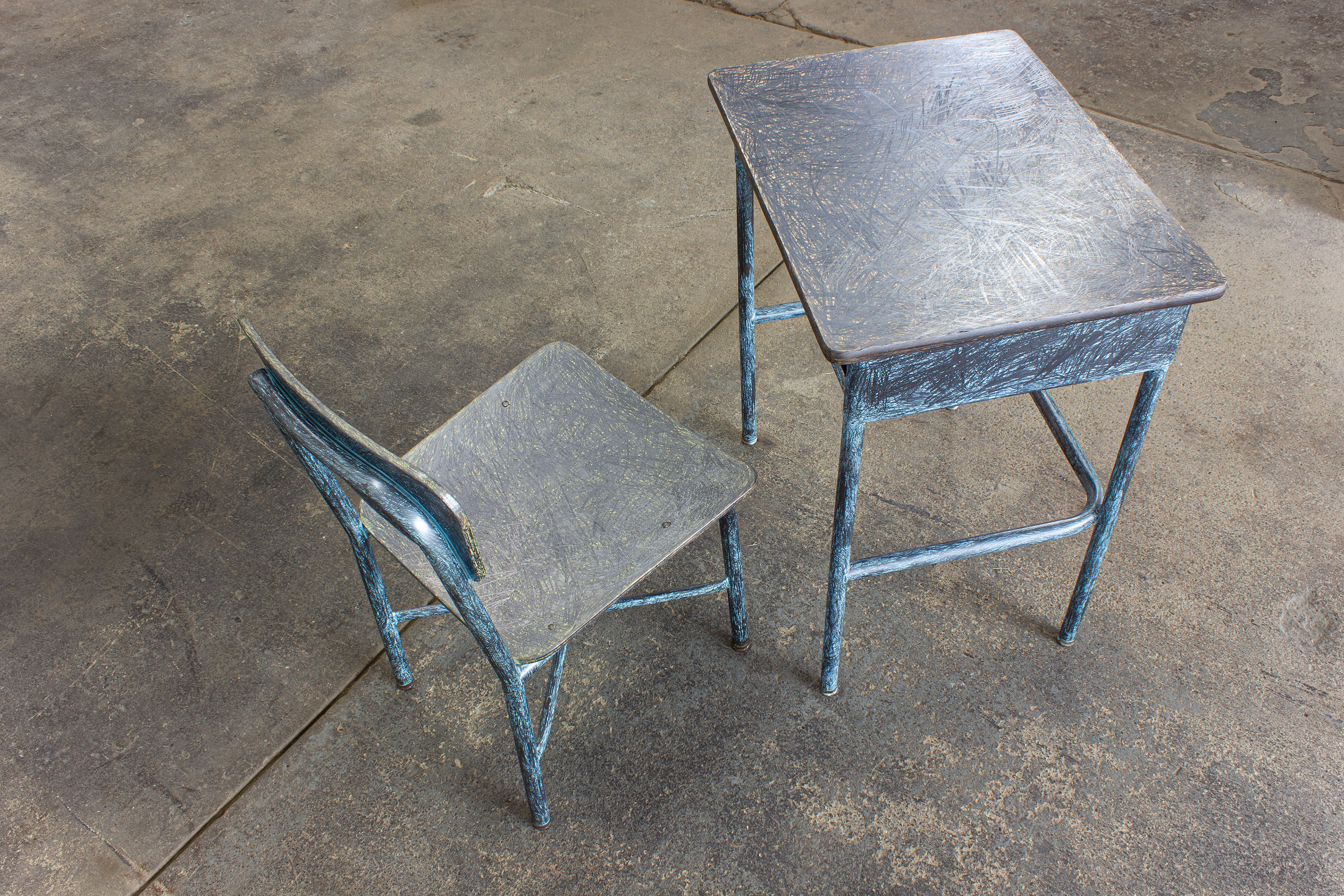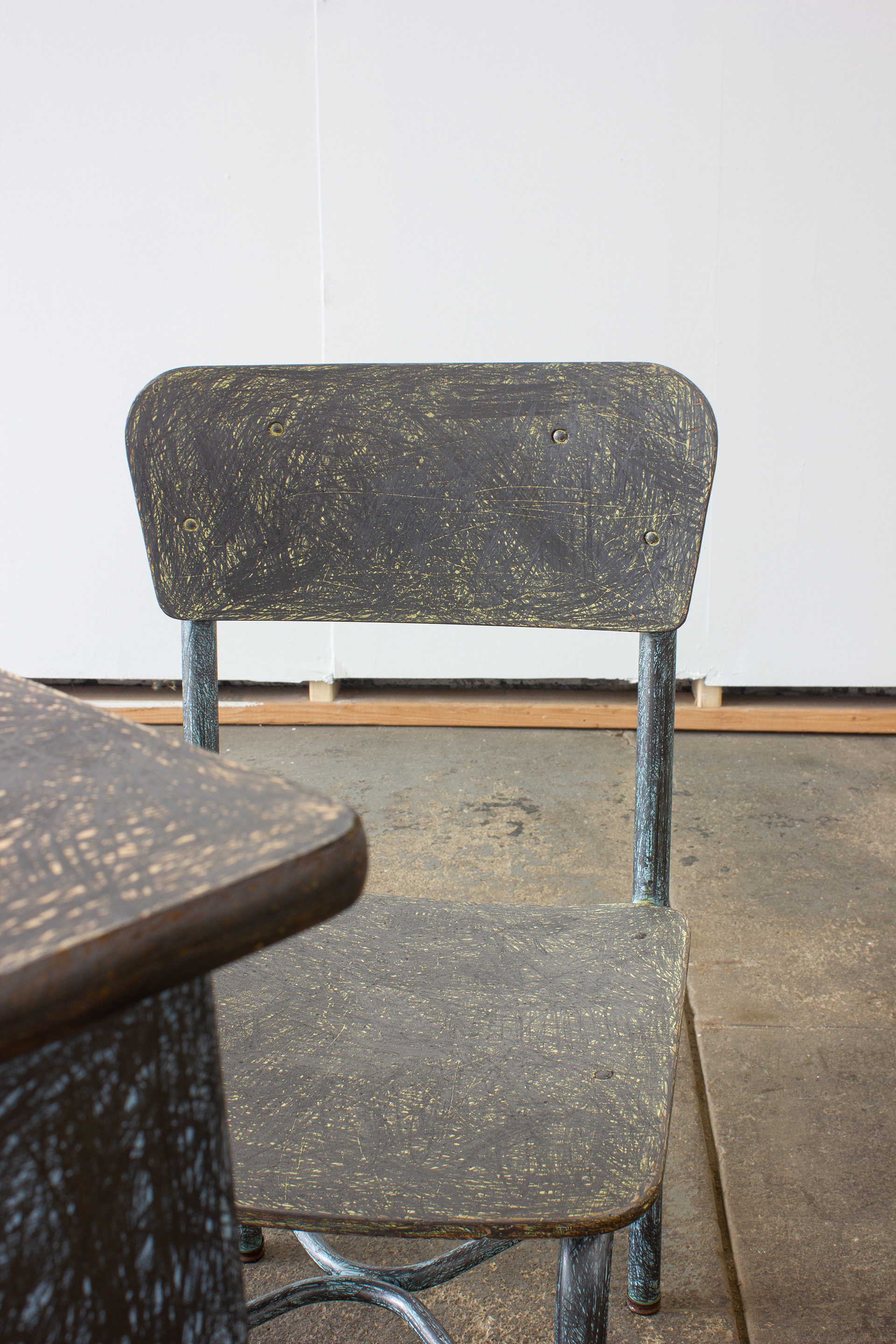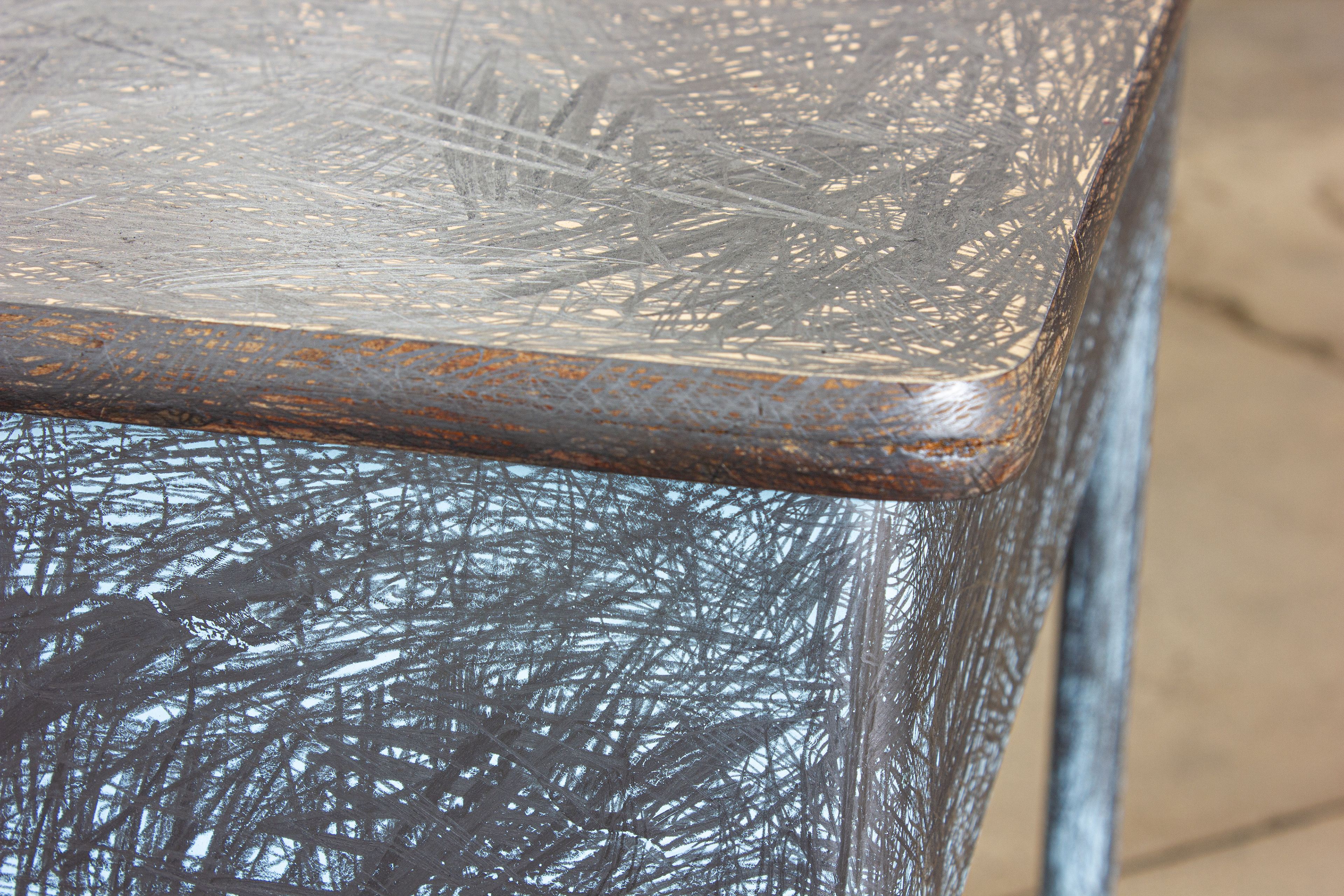 Graphite on vintage 1980s school desk approx. 29 x 24 x 22+ inches; site specific, varies